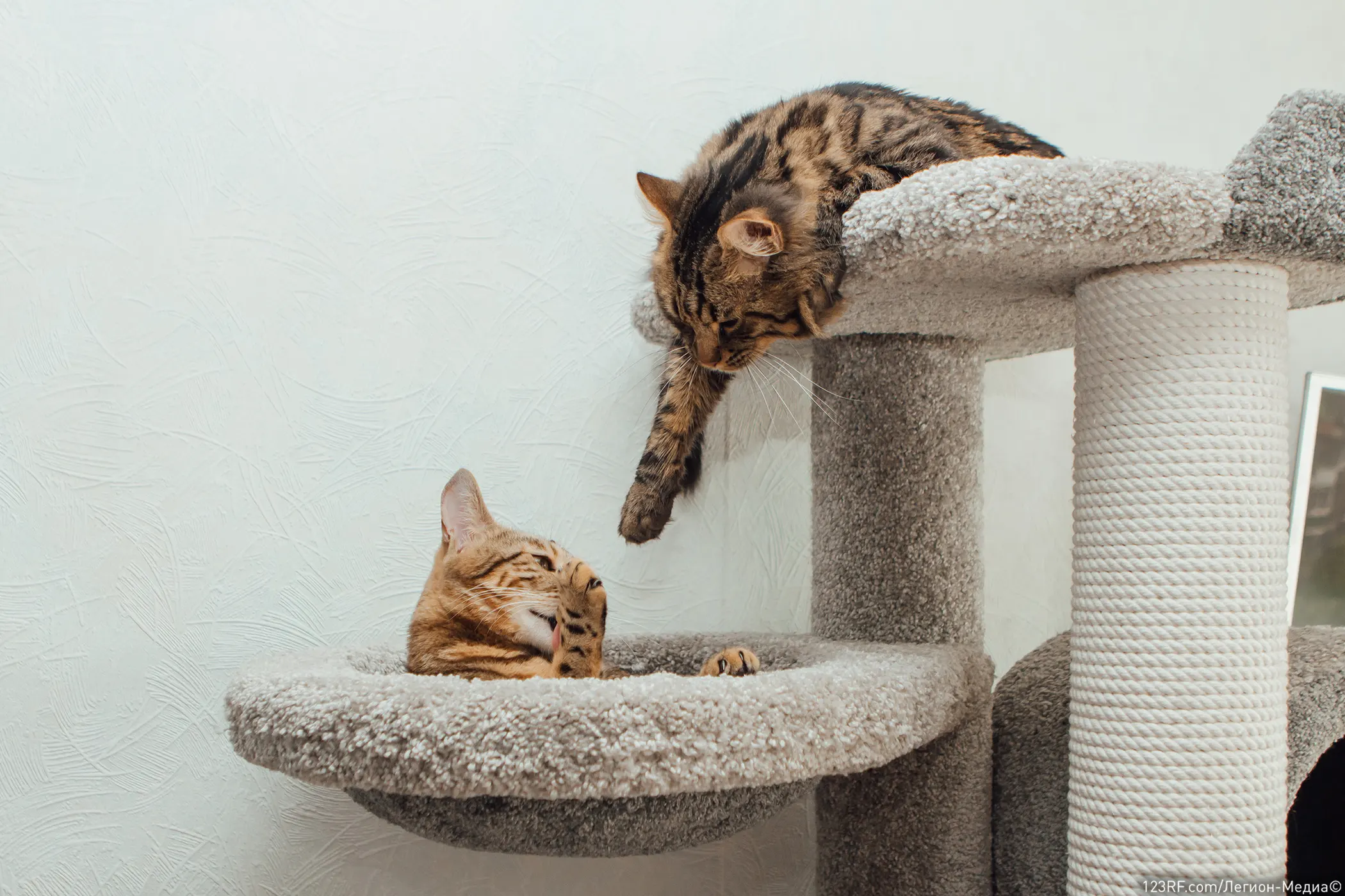У каждого животного должно быть свое личное убежище — место, где его никто не побеспокоит. Это может быть лежанка, домик, полка на стене или даже картонная коробка в тихом углу. Оборудуйте такие зоны для обоих котов в разных частях комнаты.