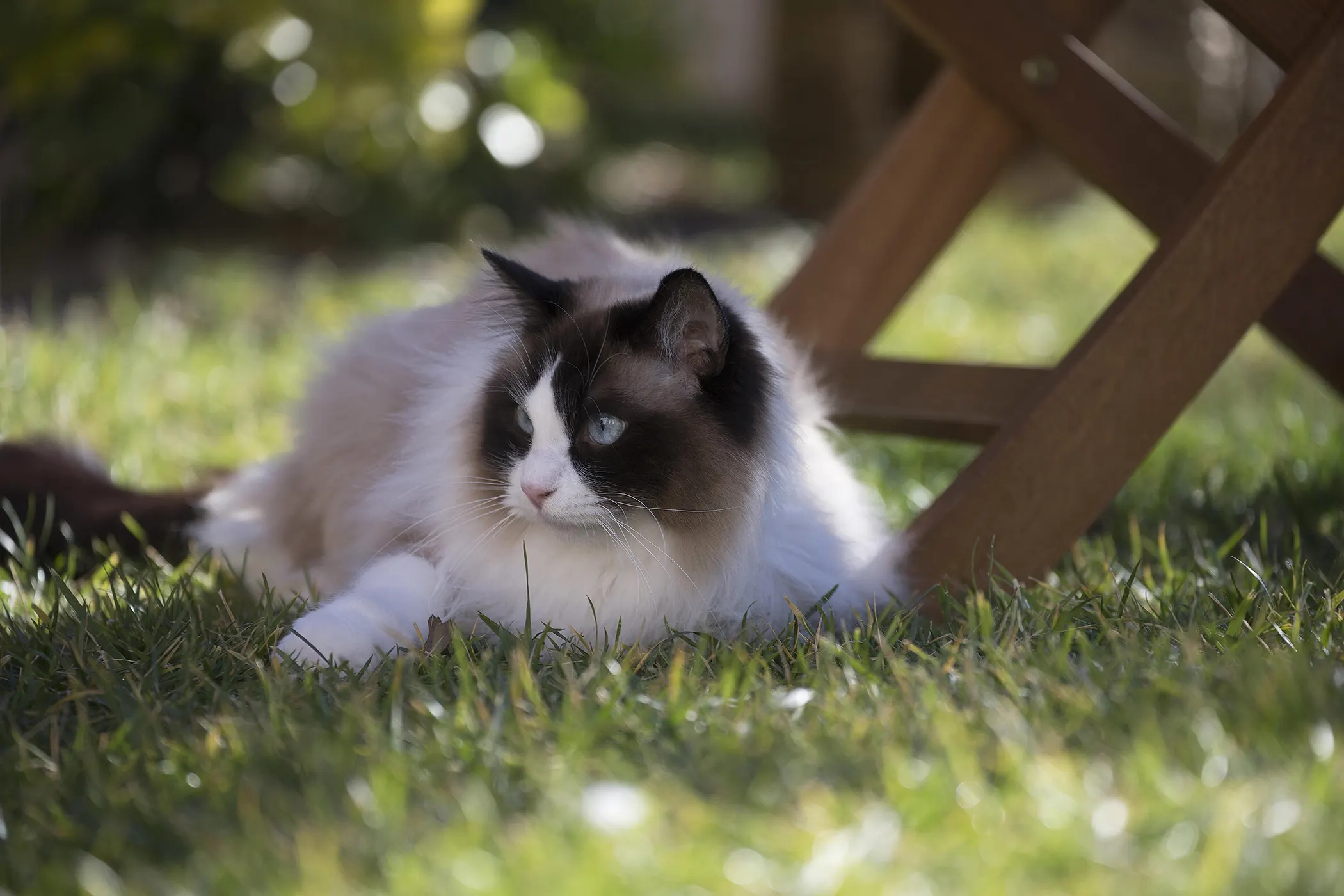 Рэгдоллы — крупные полудлинношерстные кошки с мягким характером. Их глаза овальной формы ярко-голубого цвета являются обязательным стандартом породы. Взгляд спокойный, доверчивый, усиливающий общее впечатление флегматичности и миролюбия. Размер глаз пропорционален крупной голове, но выглядит заметно больше благодаря светлому окрасу шерсти на мордочке (колор-пойнт).