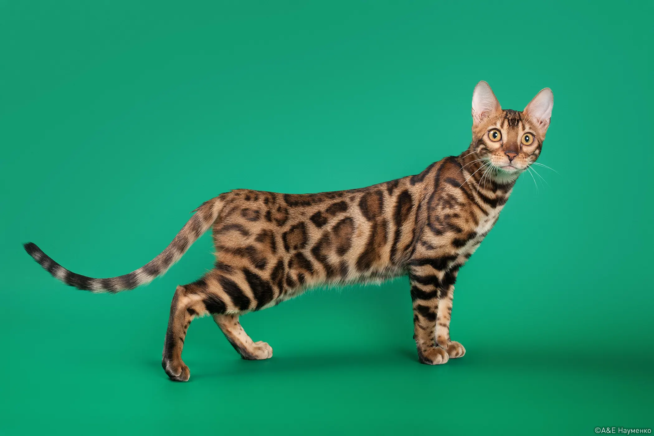 Бенгал — это кошка от среднего до крупного размера с мощным, мускулистым телом, которое никогда не выглядит грубым. Вес варьируется от 4 до 8 кг, причем самцы заметно крупнее самок. Взрослый размер достигается к 1-1,5 годам.